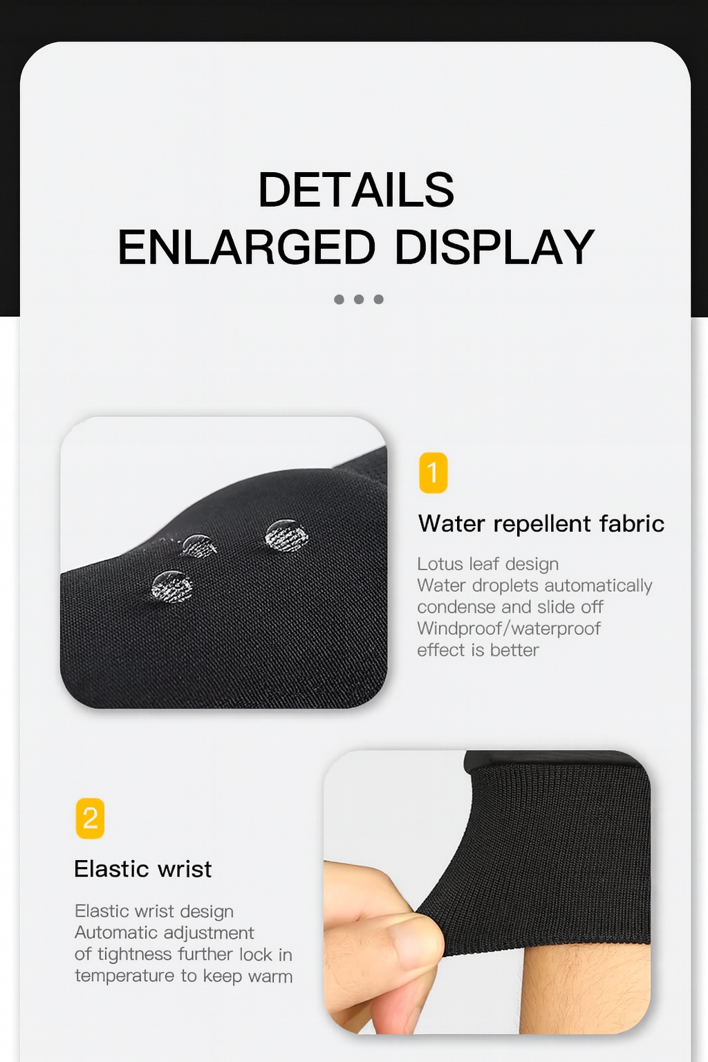 Built with a lotus leaf–style water-repellent fabric, these gloves stop rain and snow from seeping in while keeping your hands insulated and warm.